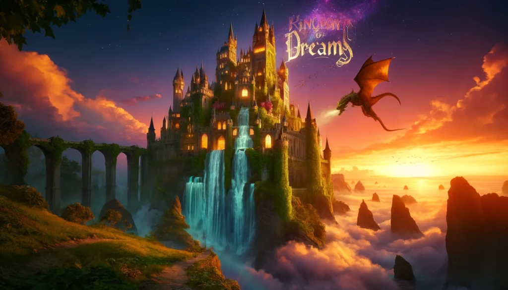 Prompt: “Create a majestic fantasy landscape featuring a towering castle with ivy-covered walls, perched on a cliffside at sunset. The castle should have glowing windows, and the scene should include a dragon flying over a sparkling waterfall. Add the text ‘Kingdom of Dreams’ in a medieval script, integrated into the sky.”