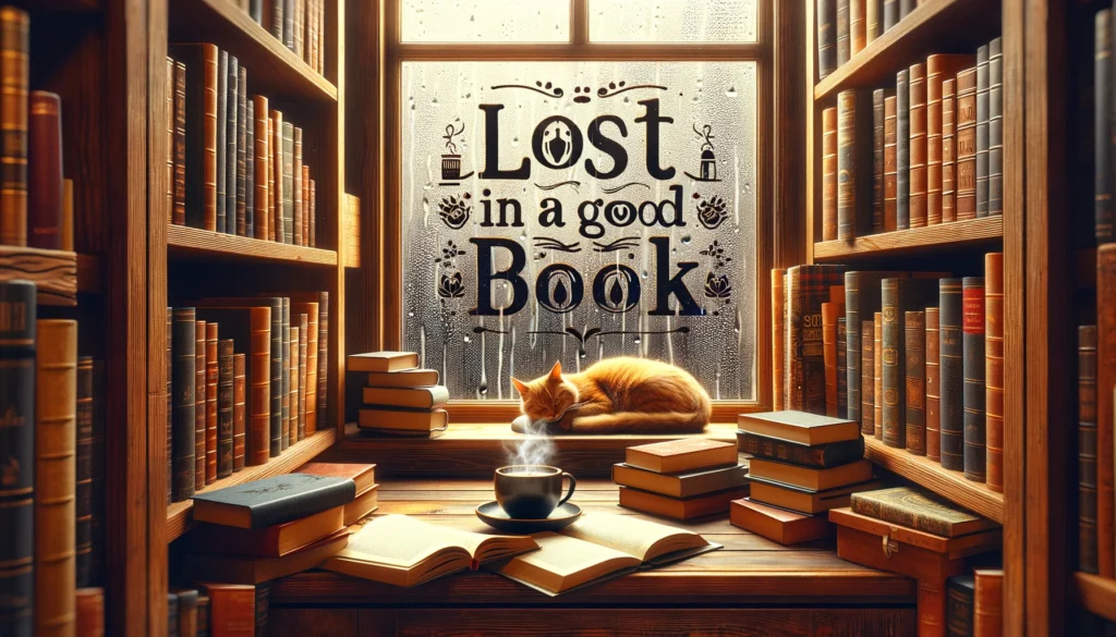 Prompt: “Illustrate a cozy bookstore interior during a rainy afternoon. The scene should include wooden bookshelves filled with books, a cat sleeping on a window sill, and a cup of steaming coffee on a table. The window should have the text ‘Lost in a Good Book’ written in raindrop patterns.”