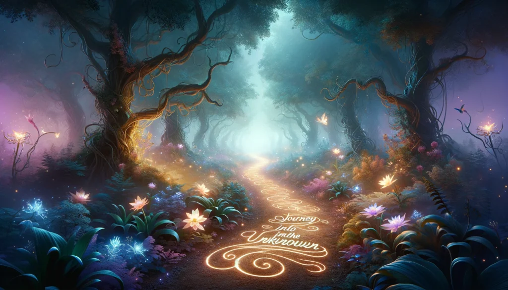 Prompt: “Design an image of an enchanted forest path at dawn, with glowing flowers and mystical creatures. The trees should have twisted branches, and a gentle mist should fill the air. Write ‘Journey into the Unknown’ along the path in an ethereal, glowing script.”