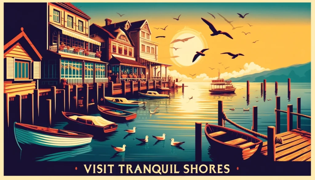 Prompt: “Create a vintage travel poster of a seaside village, with colorful boats docked at the pier and seagulls flying overhead. The sun should be setting, casting a golden glow on the water. Include the text ‘Visit Tranquil Shores’ in an elegant, retro font at the bottom of the poster.”