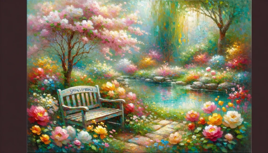 Prompt: “Create an impressionist-style painting of a vibrant garden in springtime, filled with blooming flowers and a tranquil pond. The brushstrokes should be soft and the colors vivid. Include a small wooden bench with the text ‘Spring’s Embrace’ painted on the backrest in a delicate, flowing script.”