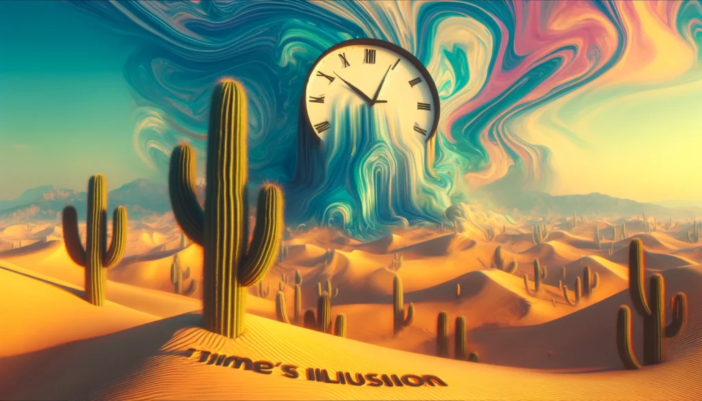 Prompt: “Design a surreal landscape of a desert with giant, melting clocks hanging from cactus arms. The sky should be a swirling mix of colors, and distant mountains should appear fluid. Write ‘Time’s Illusion’ in a dreamy, melting font integrated into the sand dunes.”