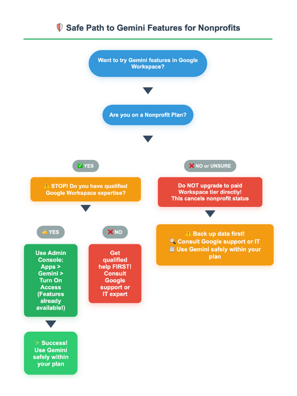 Last week, a nonprofit administrator shared a story in our community that made my heart sink – and race at the same time. Picture this: You’re passionate about your mission, you’re anxious to try the new Gemini AI tools that could help your team work more efficiently, and you’re excited to be the one who figures it out for your organization. You’re doing exactly what good leaders do – being proactive, exploring new tools, trying to make things better.
