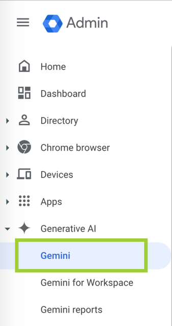 In the Admin console, go to Menu > Generative AI > Gemini.
