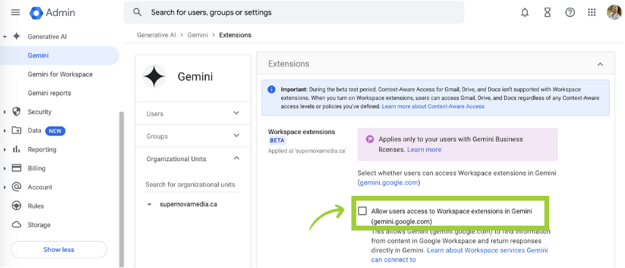 Scroll to “Extensions” and select “Allow users access to Workspace extensions in Gemini.”