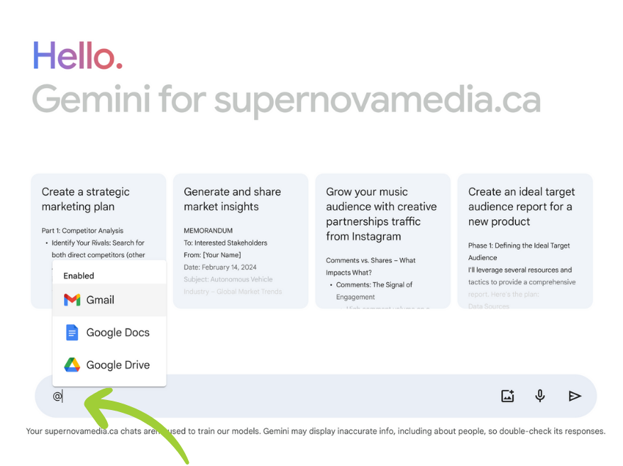 - Example Prompt: “I need to prepare a client status report for my upcoming meeting with __. Please gather latest project documents from @Google Docs summarize the key points in recent emails in @Gmail and provide any insights on potential bottlenecks.”