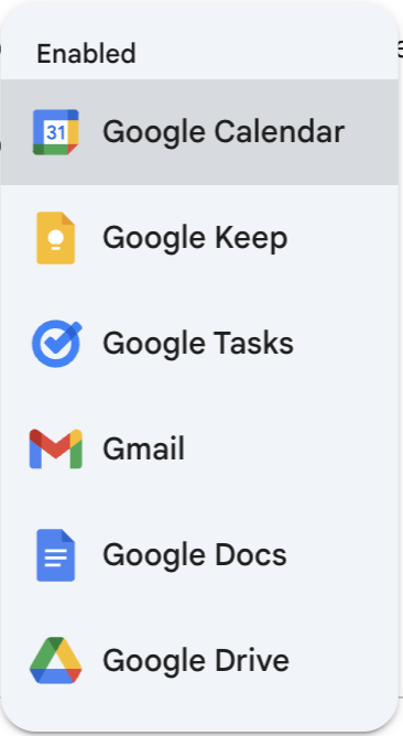 The big win for using Gems to manage clients is the seamless integration with Google Workspace and the ability to use your apps in tandem. ie: I can easily “call” items from any of these tools 👇 and even create Tasks and Calendar events.